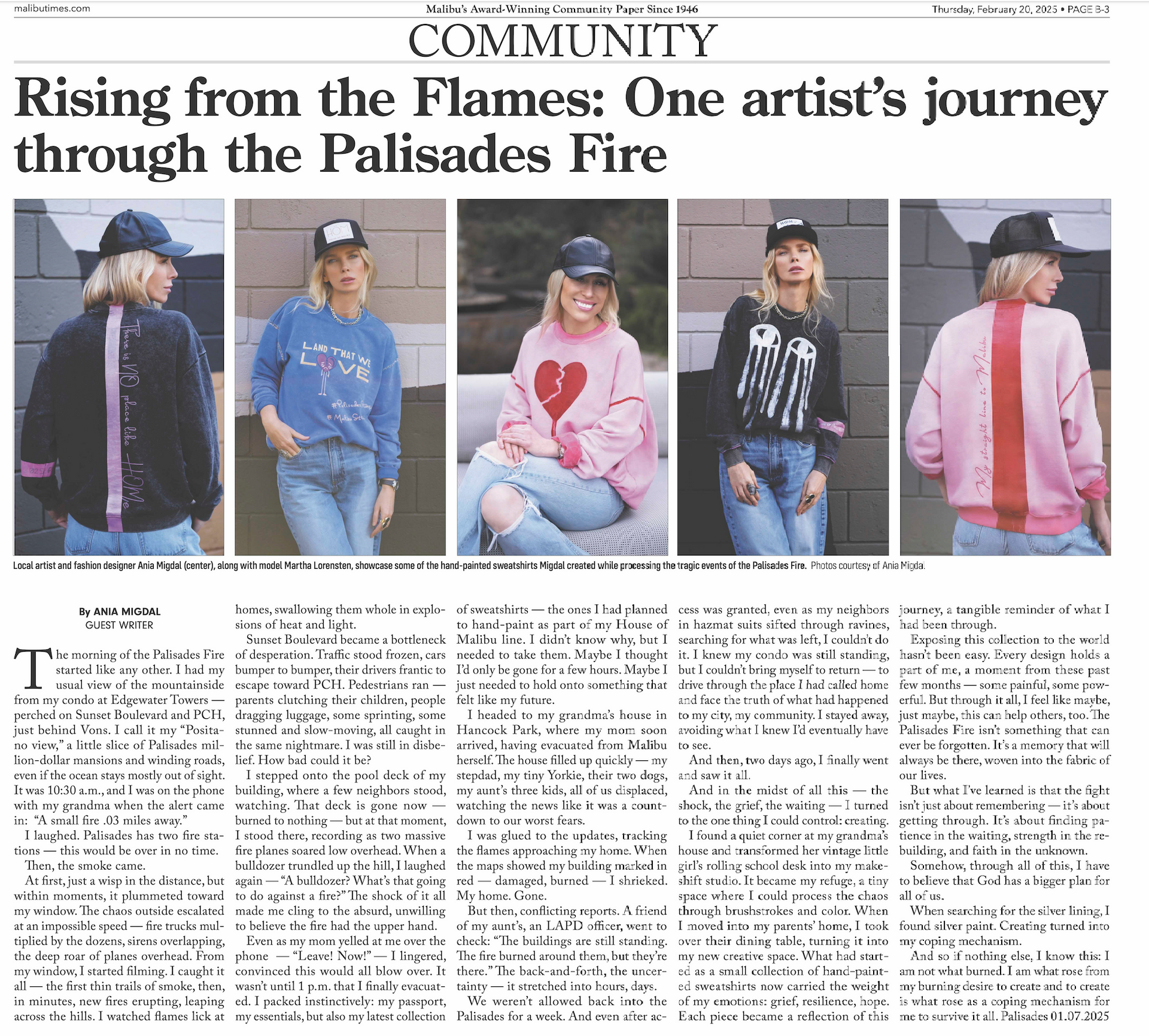 RECENTLY, THE JOURNEY became deeply personal for me, Ania, from the morning up until now, the aftermath of the Palisades Fire. :-( The moment I realized I wasn’t going home, that same night on January 7th, I picked up the paintbrush. It was the only way I could handle the anxiety and stress of the ever-growing and what seemed like never-ending fire. This sweatshirt which I am wearing in the photo to the left is actually the first sweatshirt which was born from the fear, anxiety, displacement, grief, and ultimately, the decision to create something meaningful from the ashes. Every sweatshirt since carries that same spirit—a raw look in to the story of survival, reinvention, strength, hope, gratitude, all the emotions which carry me through each day.